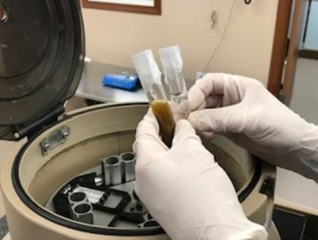 A small portion of the stool sample is transferred to a container with a lid and a special liquid is applied. Here it is shaken gently to mix then transferred to a centrifuge tube. The tube is then placed into the centrifuge machine. Once the tube with the liquid poop mixture is balanced with another tube filled with water the machine is securely closed and started. It will then be set at a specific speed to spin for 5 minutes which causes the denser particles to sink to the bottom and the less-dense particles to rise to the top.