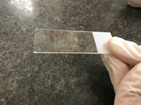 The technician then takes the coverslip and places it on top of a microscope slide. The slide is then viewed under a high powered microscope. They are looking for OVA (eggs of mature parasites) and giardia, that may be causing diarrhea.